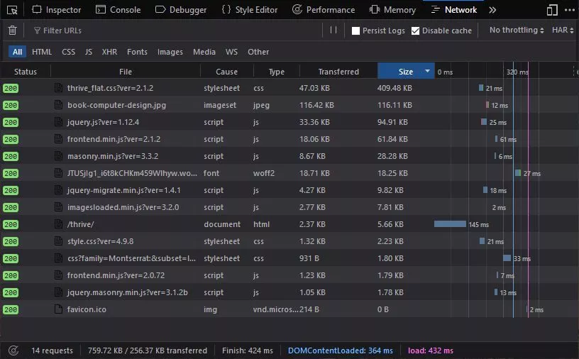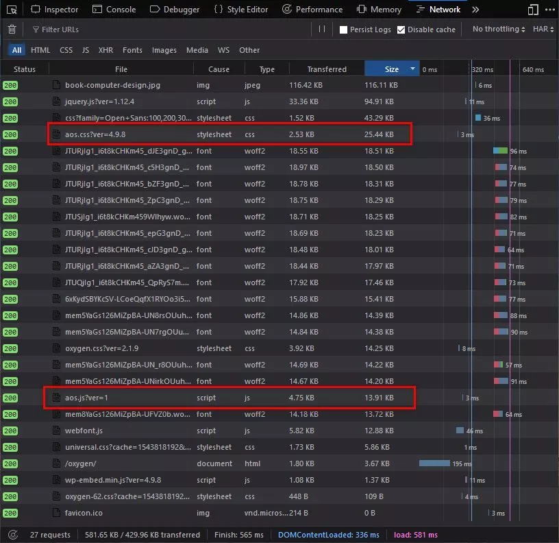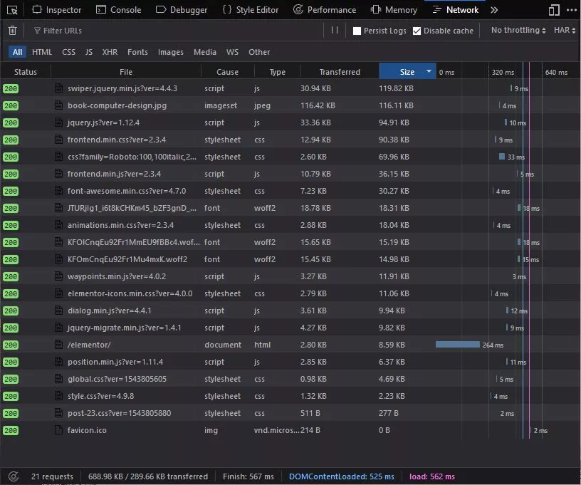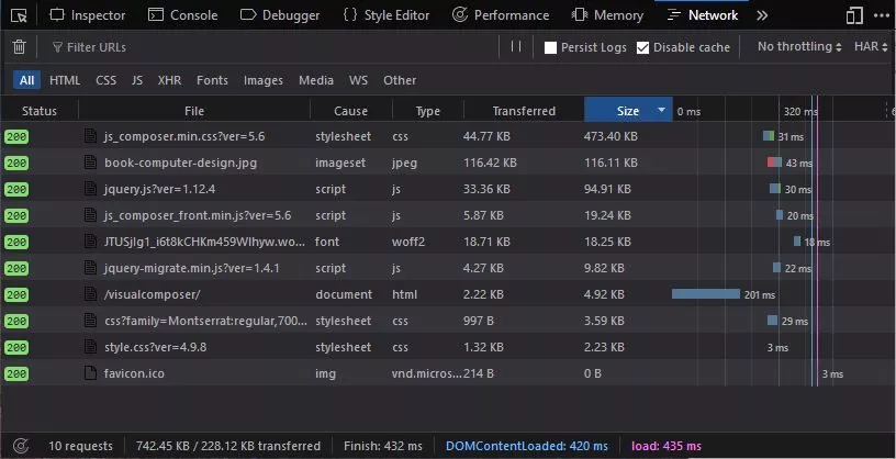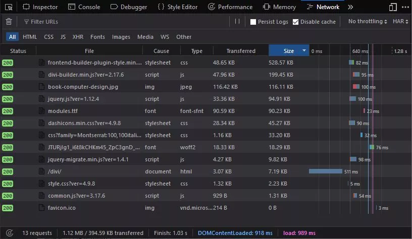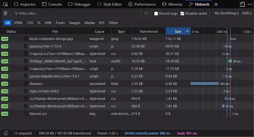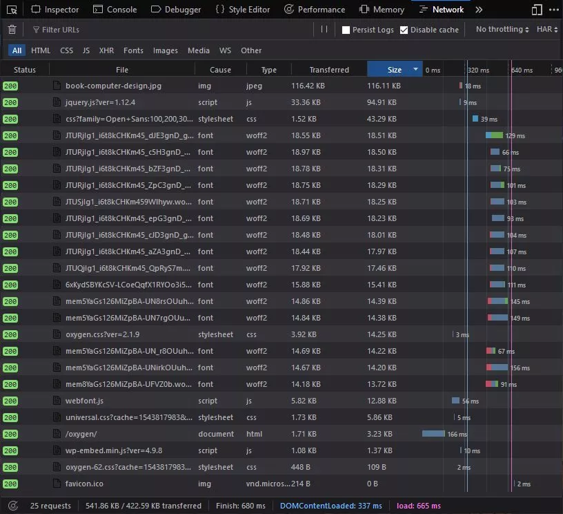 Dans les captures d’écran qui suivent, je retiens seulement la vraie taille des fichiers (Size) et non la taille lors des transferts. D’où le choix d’avoir utilisé le devtools de Firefox. Il est le seul a donner la vraie taille.