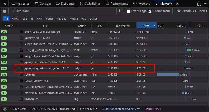 Beaver a donc ajouté la bibliothèque waypoints, qui est une des lib javascript les plus populaires (Elementor, Divi Builder et WPBakery Page Builder l’utilisent aussi).