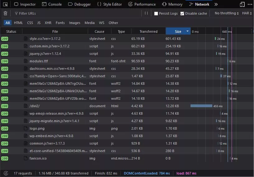 Note : J’avais utilisé la version 2.17.6 pour ces tests. Je viens de refaire le premier test avec une version plus récente (2.18.6) : Les fichiers de Divi sont encore plus gros. 😮