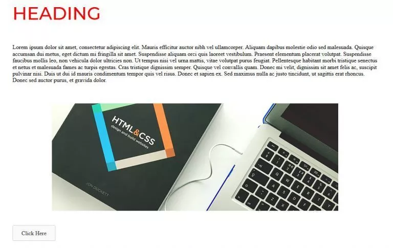 Un titre, du texte, une image et un bouton. Le titre est stylé (nouvelle taille, nouvelle couleur, nouvelle police) . On se rapproche ici d’une vraie page web, avec du contenu, même si c’est très minimaliste et pas forcement beau.